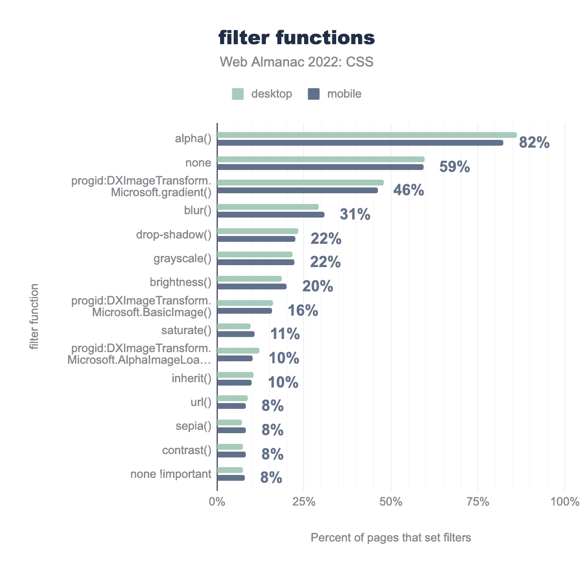 グラフィカルな効果を適用するフィルターを設定しているページの割合のうち、82%がInternet Explorer 8以下で使用される非標準の値である alpha() を使用しています。また、Microsoft.gradient() フィルターの使用率も高いことがわかります。