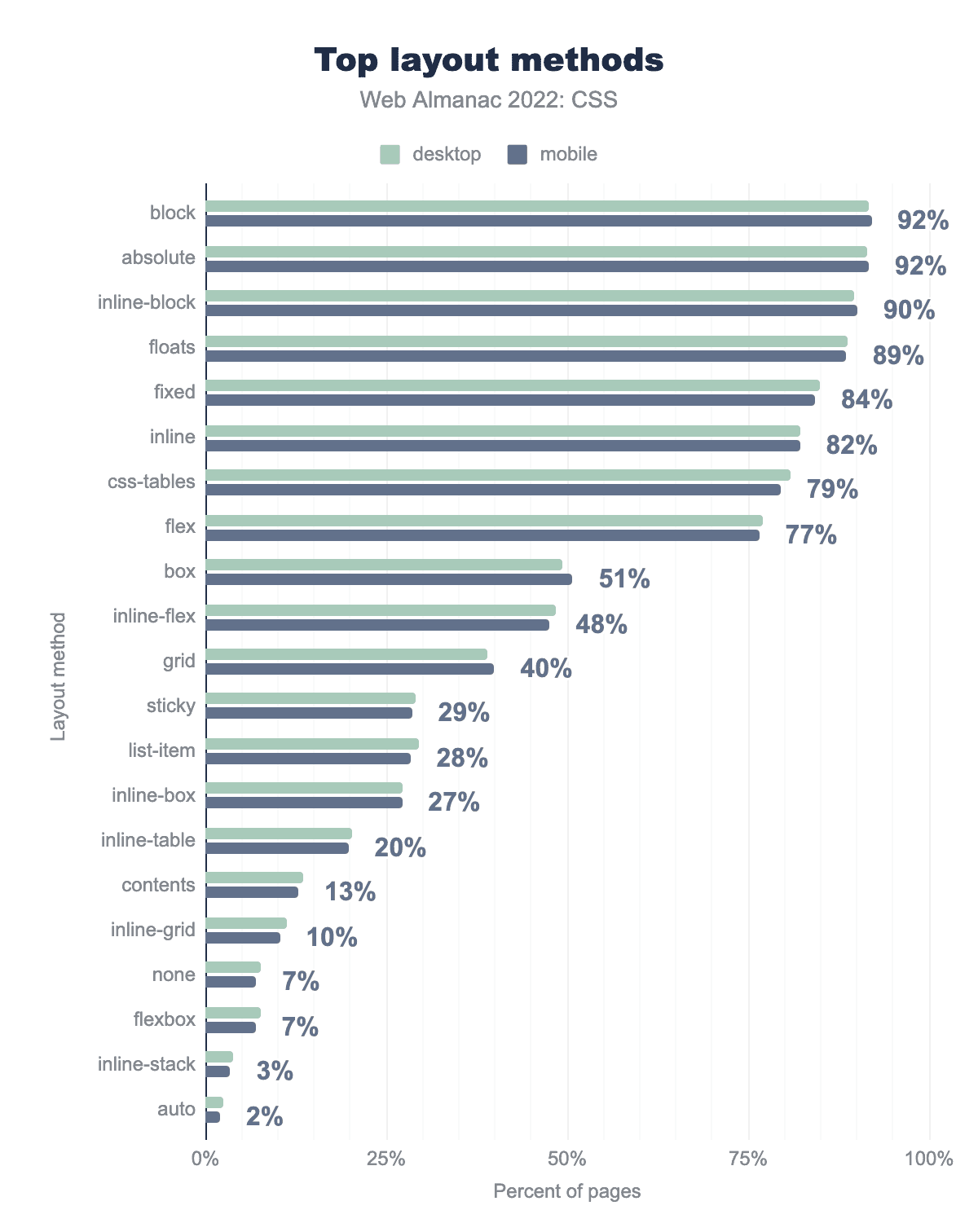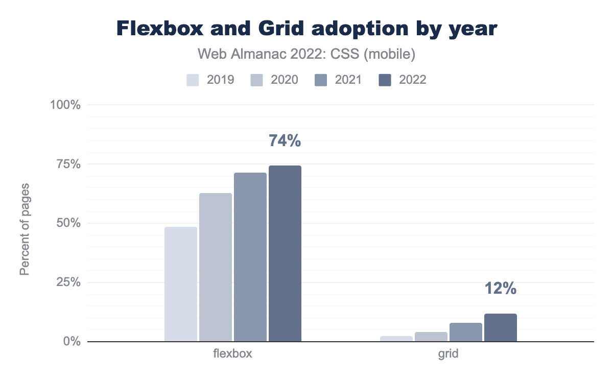 昨年の結論で述べたように、このデータは、新しい機能(グリッドレイアウトなど)やベストプラクティス(物理プロパティではなく論理プロパティの使用など)が徐々に、そして着実に採用されていることを物語っています。今後数年間、このような変化がどのように展開されるかを楽しみにしています。