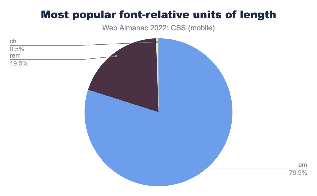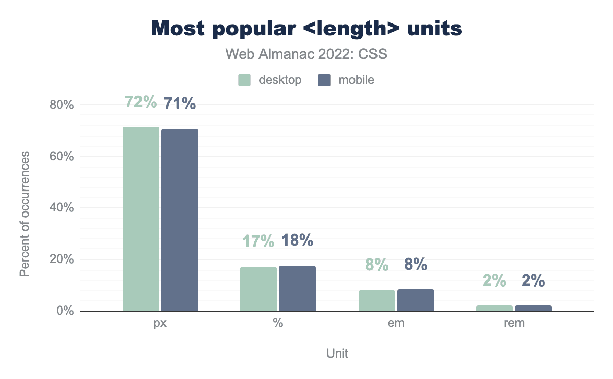 計算にピクセルを使用しているサイトの割合は9ポイント減少し、現在では%の使用率と同じ42%になっています。ビューポートの単位である vw と vh は今年2%から8%に、 em は同じだけ増加し、 rem の使用率は3%から6%に倍増しています。