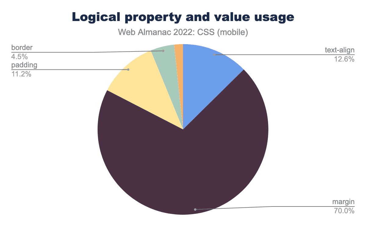marginプロパティが70.0%、text-align 12.6%、padding 11.2%、border 4.5%、inset 1.7%使用されていることがわかる。論理プロパティの使用率は、2021年からわずかに増加し、4%から5%になった。しかし、2022年のグラフは、2021年のグラフと大きく異なっています。圧倒的に多くの人が論理プロパティを使用して margin プロパティを設定しており、26%から70%に増加しています。もっとも普及している margin プロパティは margin-inline-start と margin-inline-end で、全体の9%のページで見受けられます。これらは、たとえばラベルとそれに続くフィールドの間隔が、LTRとRTLのスクリプトで同じように動作することを確認するためにとくに有用です。