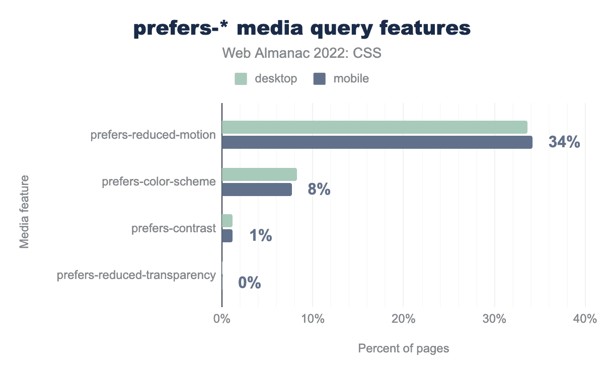 prefersが付くメディアクエリ機能を示す棒グラフ。もっとも普及している値は34%のページでprefers-reduced-motion、次にprefers-color-scheme 8%、prefers-contrast 1%、prefers-reduced-transparency 1%未満となっています。prefers-* ユーザープリファレンス機能だけを見ると、prefers-reduced-motion がもっとも普及していることがわかります。これは、ブラウザのサポートが良く、ウェブ上でアニメーションや遷移が普及していることが原因です。prefers-color-scheme 機能は、ユーザーが明るい色か暗い色のどちらを好むかをチェックする機能で、ウェブサイトやアプリケーションでダークモードを使用することが一般的になったため、使用率がわずかに増加しています。