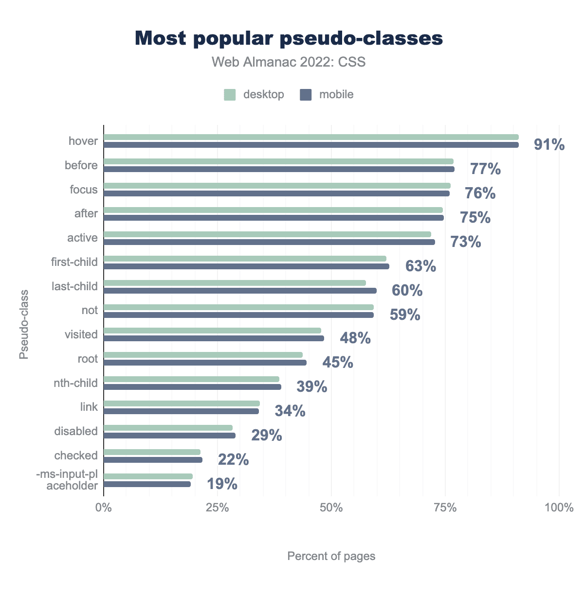 hoverが91%、before 77%、focus 76%、after 75%、active 73%、first-child 63%、last-child 60%、not 59%、その後、visitedが48%、root 45%、nth-child 39%、link 34%、disabled 29%、checked 22%、最後に -ms-input-placeholderが19%となっていて人気が急激に低下することがわかります。今回もユーザーアクション擬似クラス :hover、:focus、:active が上位3位を占めています。否定擬似クラス :not() も、カスタムプロパティを作成するために使用される :root と共に、人気が上昇し続けているようです。