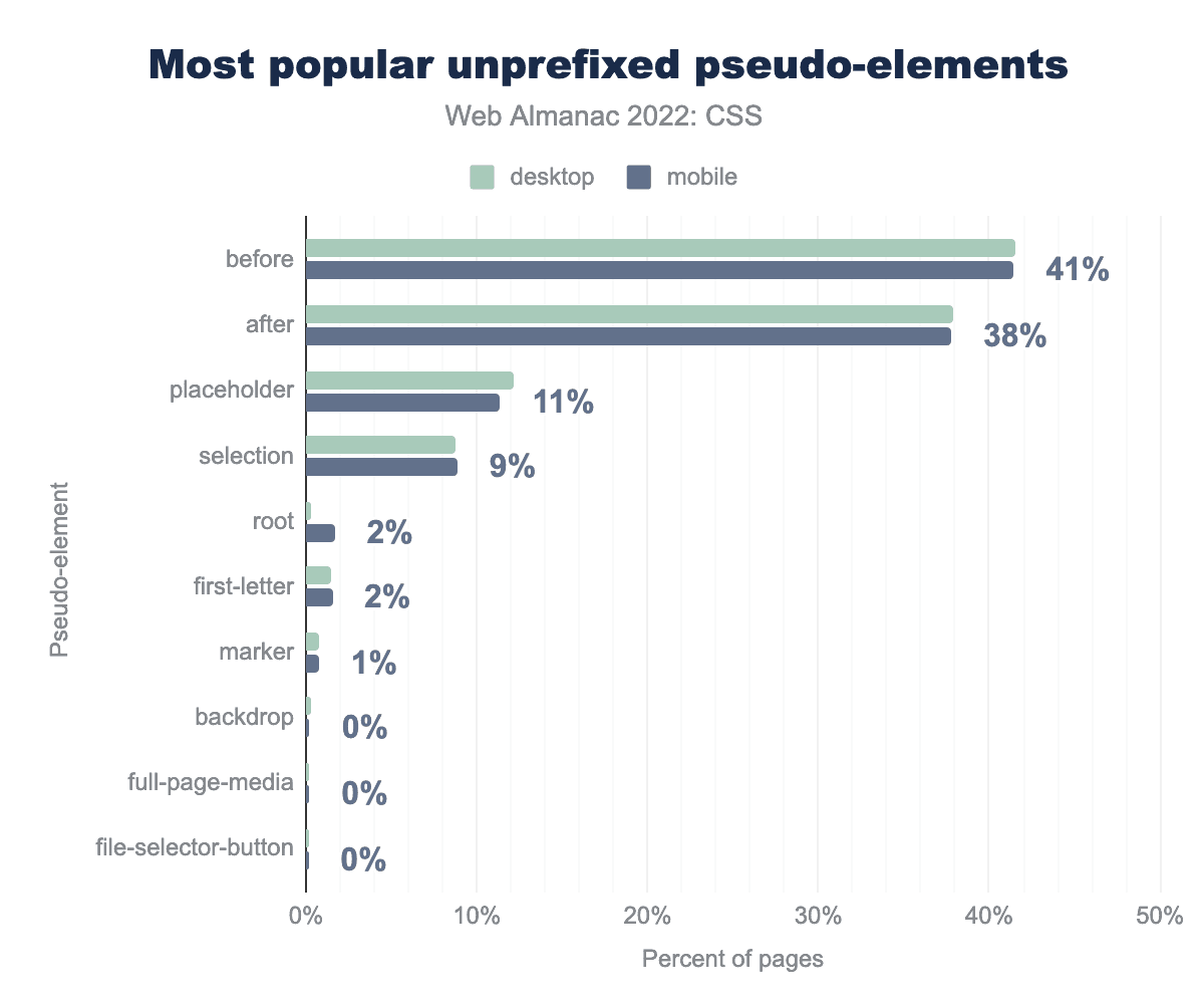 beforeが41%、after 38%、placeholder 11%、selection 9%、rootとfirst-letterが2%、marker 1%、そしてbackdrop、full-page-media、file-selector-buttonは1%未満しか登録していないことがわかります。接頭辞のついた、つまりブラウザ固有の擬似要素を除外しています。これらは通常、インターフェイスコンポーネントやブラウザクロームの一部を選択するために使用され、開発者が実際に使用している擬似要素に興味があります。