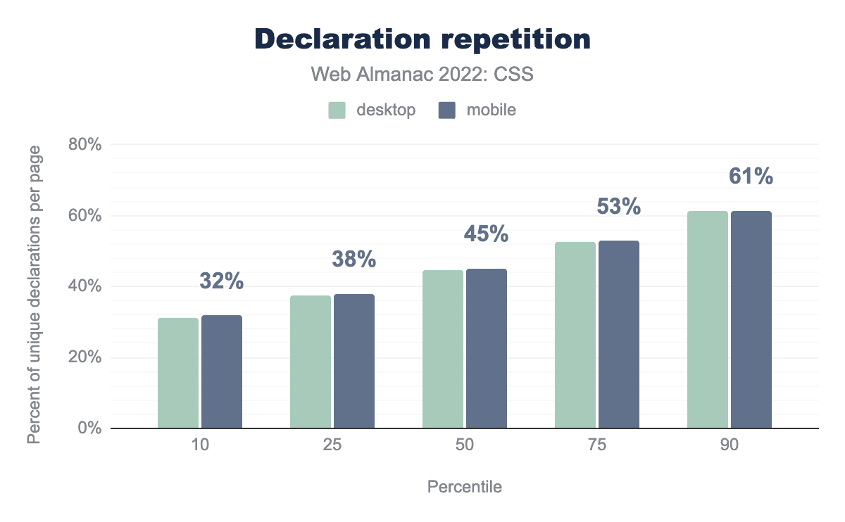 2020年と2021年には、「宣言の繰り返し」の多さを調べる分析が行われました。これは、同じプロパティと値を使用する宣言の数を調べることで、スタイルシートがどれだけ効率的かを特定することを目的としています。
