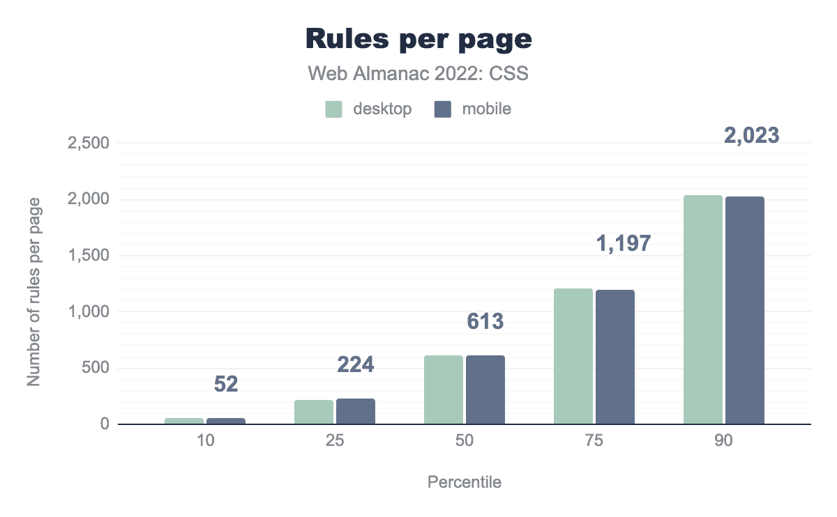 ページ内のスタイルルールの数を見ると、すべてのパーセンタイルで増加しており、低いパーセンタイルほどモバイル向け、高いパーセンタイルほどデスクトップ向けのルールが多くなっています。この増加幅は相当なものです。50パーセンタイルではデスクトップのルールが130個、90パーセンタイルでは202個増えています。