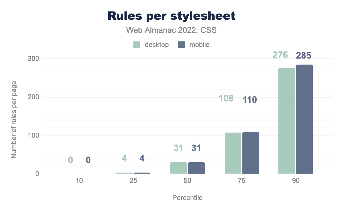 読み込まれたスタイルシートの総数から、通常、人々はCSSを複数のスタイルシートに分割していることがわかります。50パーセンタイルでは、スタイルシートごとに31ルールが読み込まれ、90パーセンタイルでは、デスクトップで276ルール、モバイルで285ルールにまで増加します。