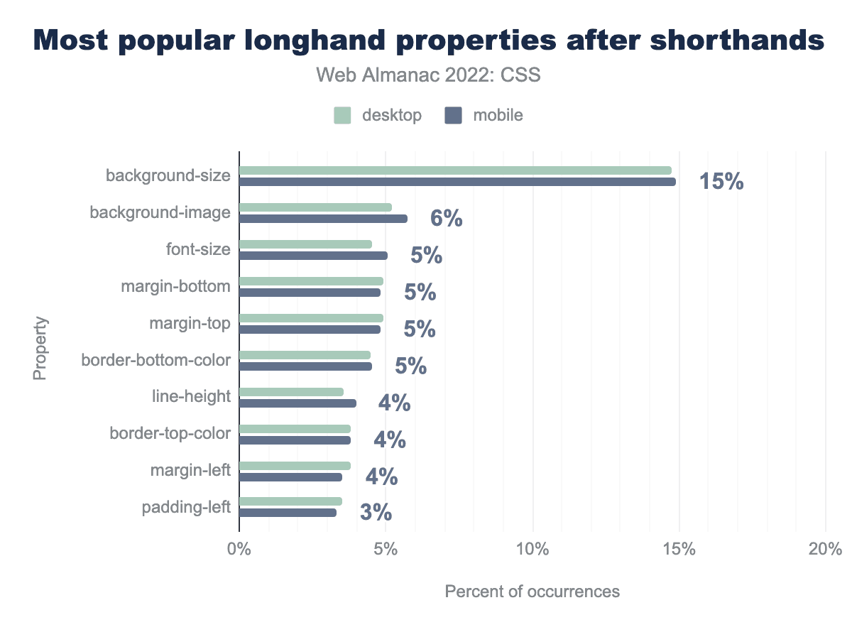 開発者がスタイルシートの中で background のようなショートハンドのプロパティと background-size のようなロングハンドのプロパティを混在させる場合、ロングハンドをショートハンドの後に置くのが常に最善とされています。私たちは、どのロングハンドがもっとも一般的であるかを確認するために、この事例を調べました。