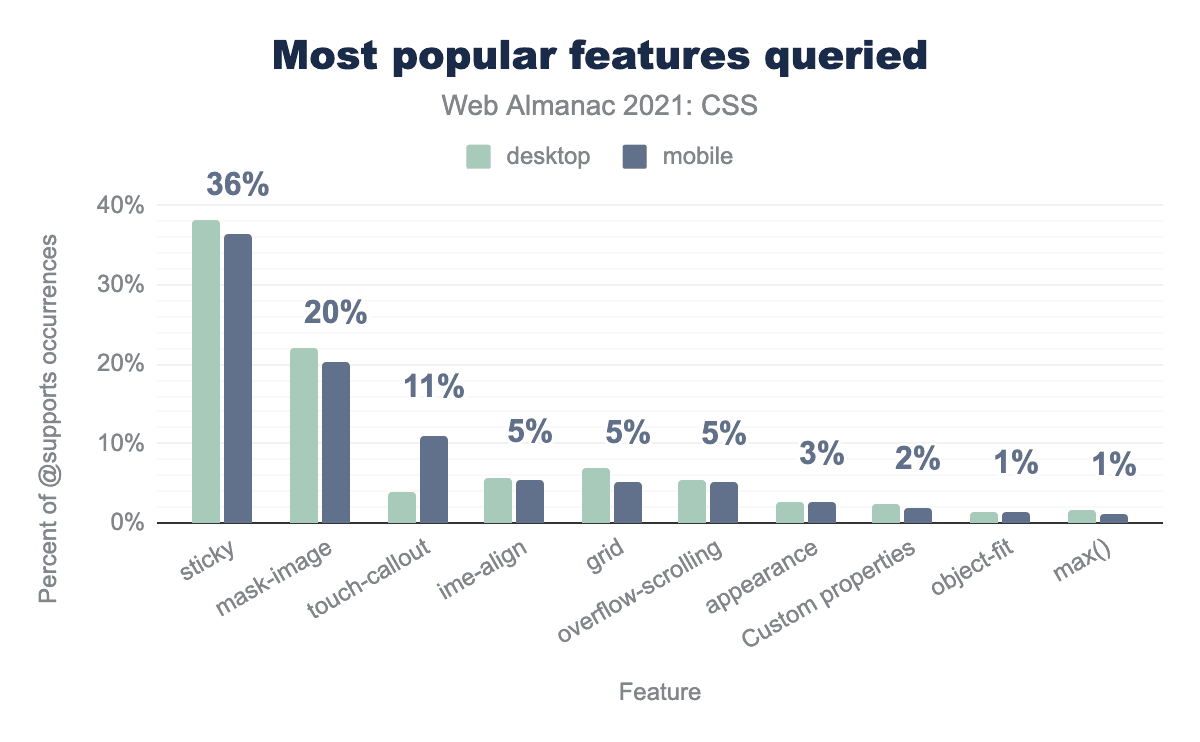 CSS機能の対応テストに使用されるフィーチャー・クエリーは、モバイルページの40%、デスクトップページの38%で確認されました。これは、2021年の48%という数字から減少しています。これは、テストされた一般的な機能のサポートが、使用前に機能のテストを気にする必要がないほど大きくなっていることを示しているのかもしれません。