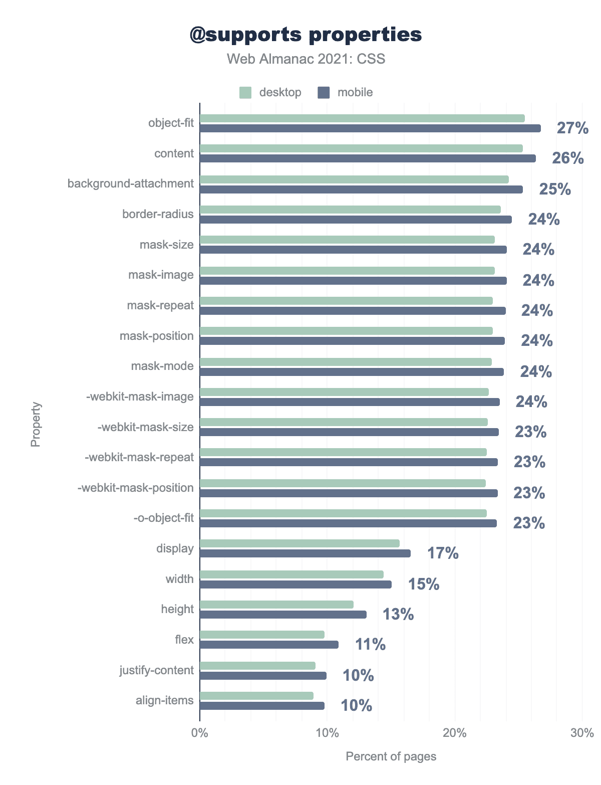 content 26%、background-attachment 25%、border-radius、mask-size、mask-image、mask-repeat、mask-position、mask-mode 24%、-webkit-mask-size、 -webkit-mask-repeatおよび -o-object-fit 23%、display 17%、width 15%、height 13%、flex 11%、justify-contentおよびalign-items 10%と続いています。サポートテストを行った後、これらの機能クエリブロックの内部で、どのプロパティを使用するのでしょうか?object-fit プロパティがもっとも多く、 mask-* プロパティは -webkit-mask-* プロパティと同様に良い結果を出しています。これは、最近までマスクの相互運用性がなく、Chromeではプロパティがまだ -webkitプレフィックスを必要と、したためと思われます。