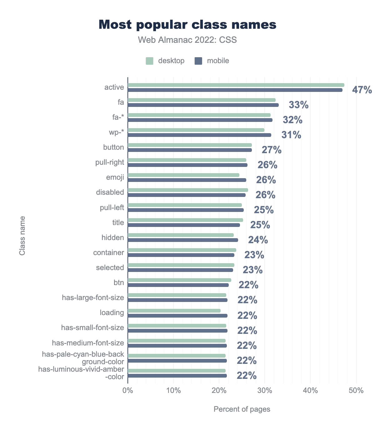 activeで、47%のページで使用されています。次にfaが33%、faをプレフィックスとする他のクラスが32%、wpをプレフィックスとするクラスが31%となっています。残りの上位10クラスは、降順に並べると次のようになります。buttonが27%で adoption、 pull-right、 emoji、 disabled が26%、最後に pull-left と title が25%となっています。2020年、2021年と同様、ウェブ上でもっとも普及しているクラス名はactiveです。Font Awesomeのプレフィックスであるfa、fa-*は依然として2位と3位を占めています。しかし、wp-*クラス名は順位を上げ、4位となりました。2021年には20%だったのが、現在では31%のページで表示されています。また、has-large-font-sizeといったクラス名も登場しており、これらは新しいWordPressブロックエディターで使用されています。