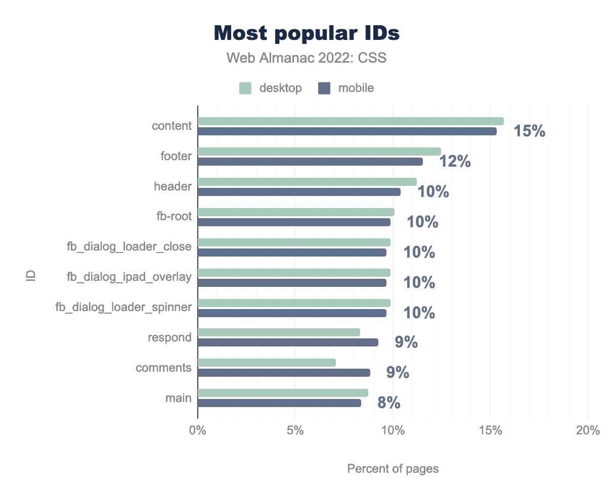 contentは15%のページで使用され、次にfooterが12%、header、fb-root、fb_dialog_loader_close、fb_dialog_ipad_overlay、fb_dialog_loader_spinnerが10%、respondとcomments%、そして最後にmainが8%のページで使用されていることがわかります。ID名はcontentがもっとも普及しており、footer、headerがそれに続く。fb_で始まるIDは、Facebookウィジェットの使用を示しています。2021年には、GoogleのreCAPTCHAシステムの使用を示すrc-で始まるIDが7%のページで見られ、FacebookのID名に押されてトップ10から外れたものの、現在も同じ頻度で見られています。