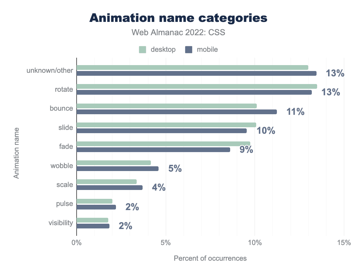 rotate 13%、bounce 11%、slide 10%、fade 9%、wobble 5%、scale 4%、pulse 2%、visibility 2%となっています。開発者がアニメーションを何に使っているかを理解するために、アニメーションクラスに使われている名前を見てみました。たとえば、クラス名に spin が含まれるものは、rotateと判断されます。Rotateアニメーションは、2021年と同じくもっとも普及しています。しかし、その割合は18%から13%に低下し、bounceアニメーションは5位から3位にランクアップしています。