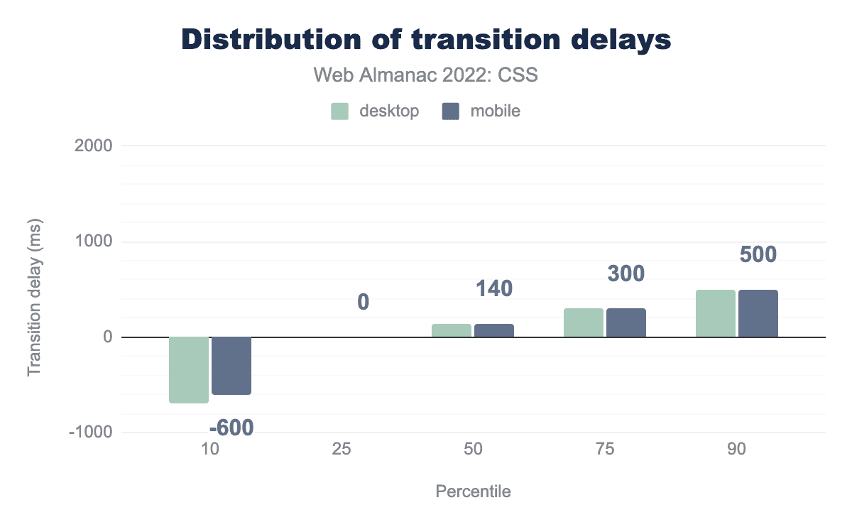 遷移の持続時間を見ると、昨年からの変化が見られます。 2021年、90パーセンタイルでは、遷移時間の中央値は0.5秒でしたが、現在では1秒に跳ね上がっています。上位4つのパーセンタイルすべてで増加していることがわかります。