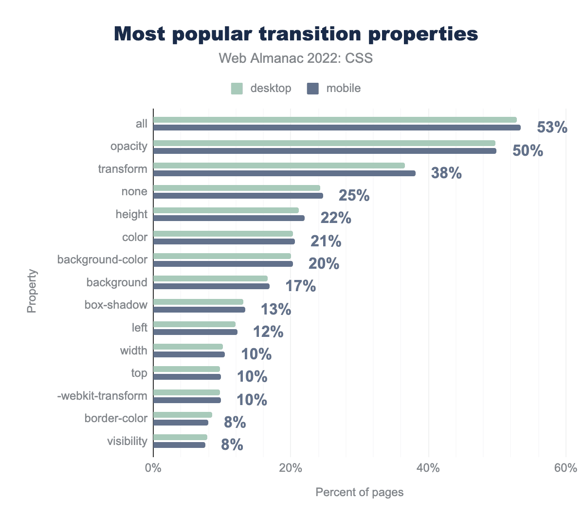昨年と同様、もっとも一般的な使用法は、allキーワードですべてのアニメート可能なプロパティにトランジションを適用することです。この使用法は7ポイント増の53%に達し、次いで50%のページで opacity が使用されています。