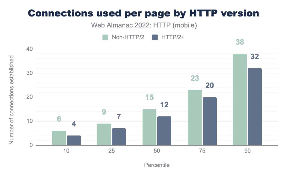 上の図は、HTTP/2が有効な場合、中央値のモバイルページがページロード中に12の接続を確立していることを示しています。これに対し、HTTP/2が有効でない中央値のページでは15の接続が確立され、追加で3つの接続が生じるというオーバーヘッドがあります。しかし、より高いパーセンタイルではオーバーヘッドはさらに悪化します。HTTP/2が有効な90パーセンタイルのページは32の接続があり、HTTP/2が有効でない90パーセンタイルのページは38の接続があり、6つの追加接続のオーバーヘッドがあります。これらの傾向は、デスクトップ版とモバイル版のウェブサイト間で同様です。