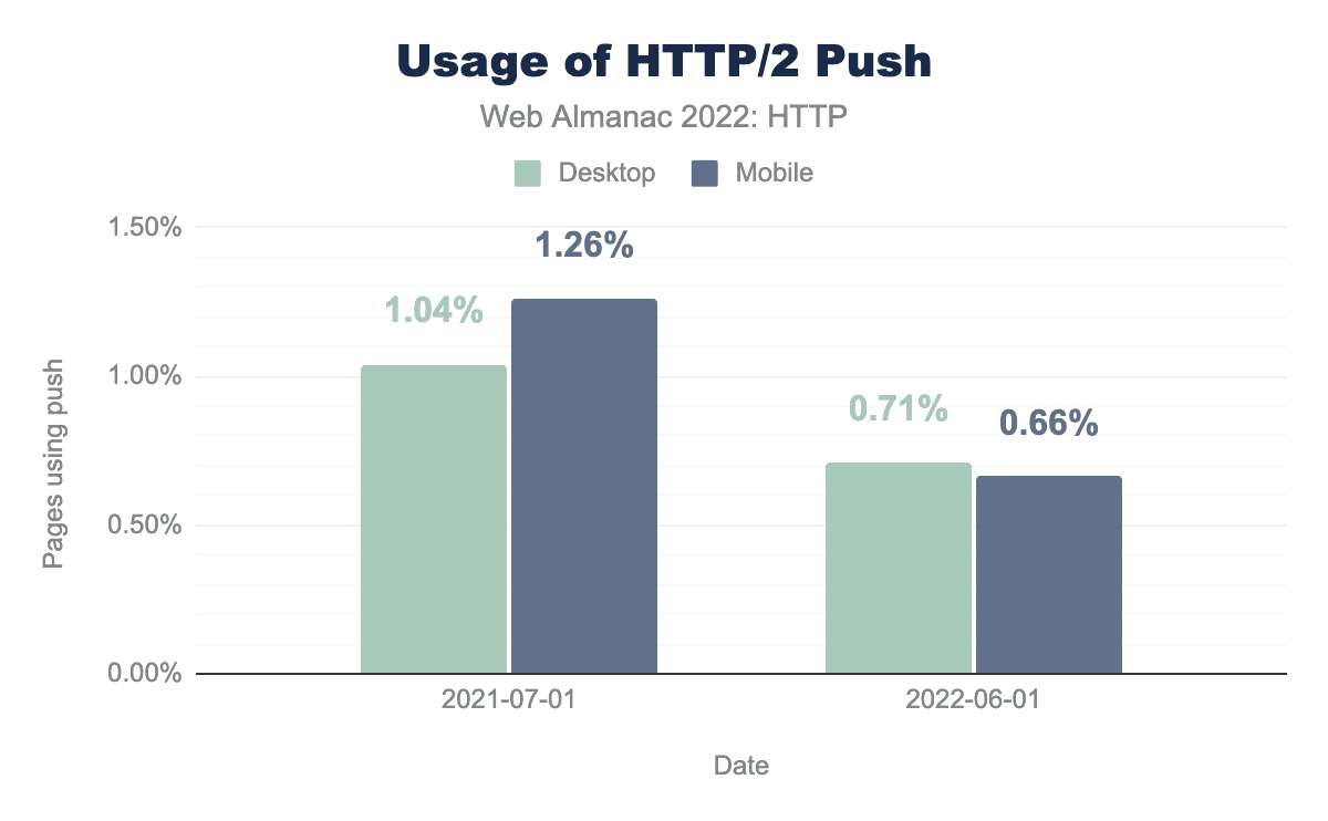 この困難さにより、ChromeはHTTP/2 Pushを非推奨とすることを決定し、Chromeバージョン106から始まりました。プッシュは公式にはまだHTTP/3標準の一部ですが、HTTPアーカイブクローラーが使用するChromeはHTTP3接続に対してプッシュを実装しておらず、それが使用減少の一因となり、サイトがそのバージョンに移行しプッシュ機能を失ったと考えられます。