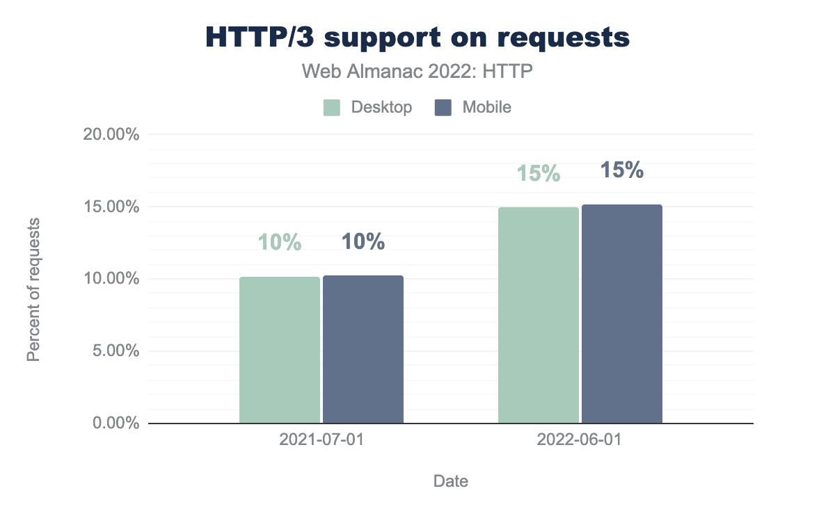 上の図は、昨年のWeb Almanac以来、HTTP/3サポートがあるリクエストの割合が10%から15%に5ポイント増加したことを示しています。デスクトップとモバイルのリクエストで同様の増加が観察されました。