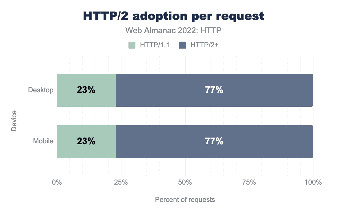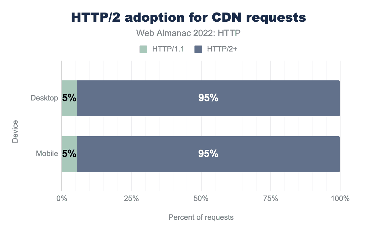 HTTP/2+の採用を促進する別の要因はCDNから提供されるリソースです。2021年の分析での観察と同様に、CDNから提供されたほとんどのリソースがHTTP/2+でした。上記の図は、CDNから提供されたリクエストの95%がHTTP/2+で提供されたことを示しています。