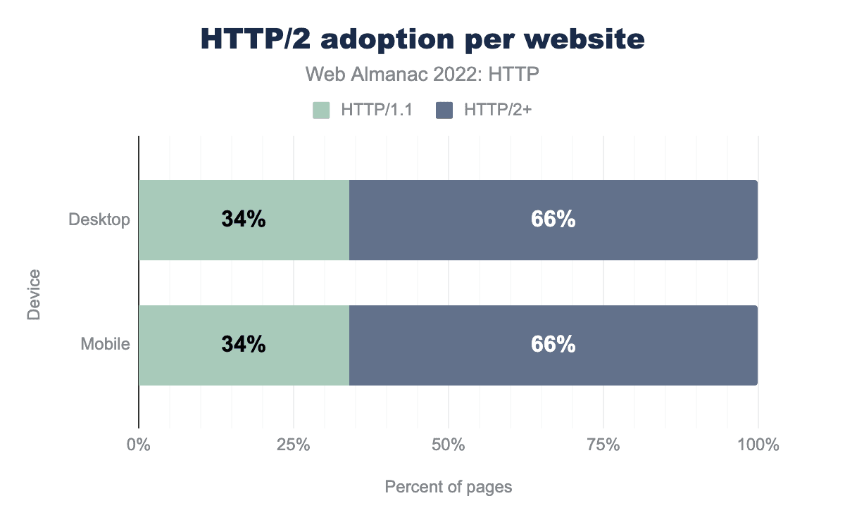 HTTP/2+の普及率の増加を理解するために、まず、ウェブサイトのランディングページがHTTP/2+で提供されているかどうかを確認することで、ウェブサイト単位でのHTTP/2+の採用を分析します。データセットの約66%のウェブサイトが、デスクトップとモバイルの設定でHTTP/2+で提供されていましたが、2021年のデータセットでは約60%のウェブサイトがそうでした。この増加は、ウェブサイトが最新のHTTPバージョンへ移行していることを示すポジティブな傾向です。