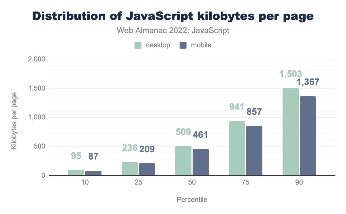昨年に引き続き、今年もブラウザに搭載されるJavaScriptの量が増えています。2021年から2022年にかけて、モバイル端末では8%の増加、一方、デスクトップ端末では10%の増加が確認されています。この増加幅は例年より少ないものの、それでも懸念される傾向が続いています。デバイスの性能は向上し続けていますが、すべての人が最新のデバイスを使用しているわけではありません。JavaScriptが増えれば増えるほど、端末のリソースに負担がかかるのは事実です。