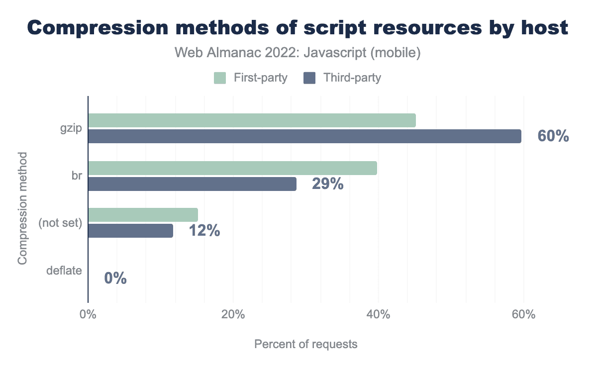 JavaScriptの状況は、昨年のトレンドが示唆するように、ほぼ継続しています。確かに提供数は増えていますが、minifiation、リソースヒント、圧縮、さらには使用するライブラリに至るまで、さまざまなテクニックを利用することで過剰なJavaScriptの悪影響を軽減しようとしています。