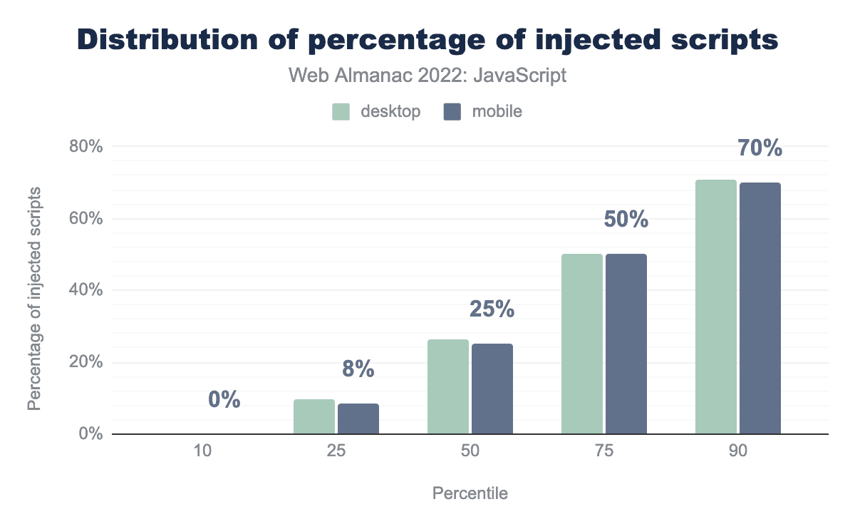 中央値では、ページのスクリプトの25%が注入され、最初のHTML応答で発見できるようにするのとは対照的であることがわかります。さらに問題なのは、ページの75パーセンタイルと90パーセンタイルでは、それぞれ50%と70%のスクリプトが注入されていることです。