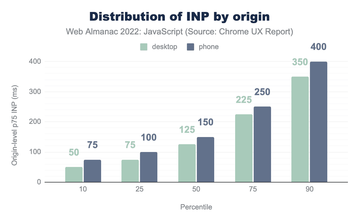 良いINPスコアは200ミリ秒以下だと考えてください。中央値では、モバイルとデスクトップの両方がこの閾値を下回っていますが、75パーセンタイルでは別の話で、モバイルとデスクトップの両方のセグメントが「要改善」の範囲に大きく入っています。このデータは、FIDとはまったく異なり、INPスコアがあまりよくない主な原因であるページ上の 長いタスクを減らすために、ウェブサイトができることをすべて行う機会がたくさんあることを示唆しています。