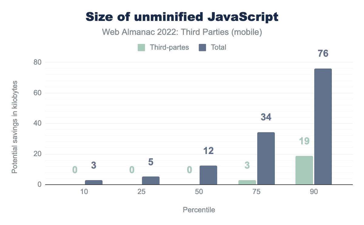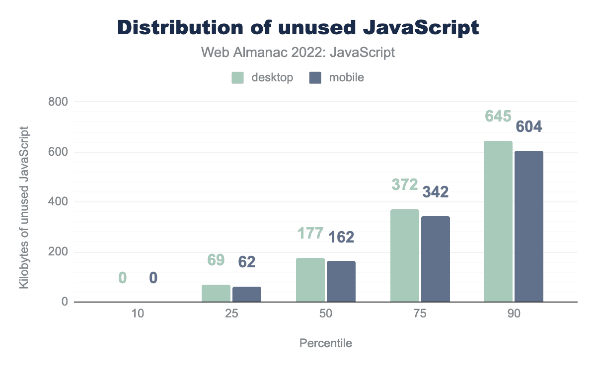Lighthouse によると、中央のモバイル ページでは、162KBの未使用のJavaScriptがロードされているそうです。90パーセンタイルでは604KBのJavaScriptが、未使用であることがわかります。これは、未使用のJavaScriptの中央値と90パーセンタイルがそれぞれ155KBと598KBであった昨年からわずかに上昇したものです。とくにこの分析ではJavaScriptリソースの転送サイズを追跡しているため圧縮されている場合は、使用されたJavaScriptの解凍部分が、このグラフが示すよりもはるかに大きい可能性があることを考えると、この量は未使用のJavaScriptに相当します。