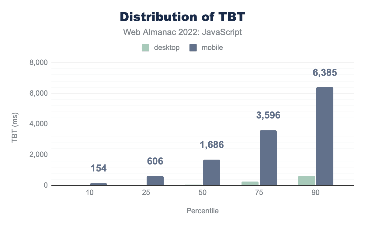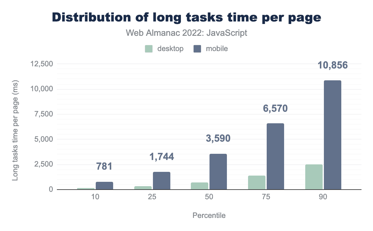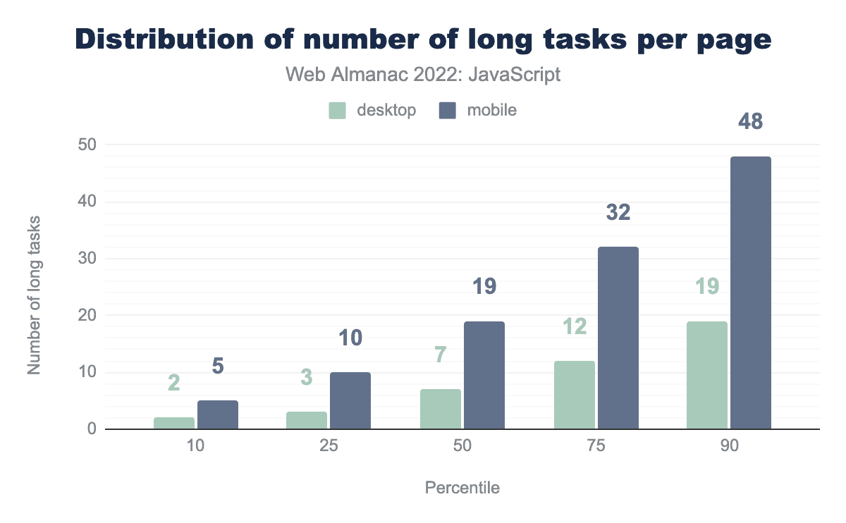 中央値のページは、モバイルデバイスで19の長いタスクに遭遇し、デスクトップデバイスでは7の長いタスクに遭遇しています。もっとも、デスクトップ端末はモバイル端末よりも処理能力やメモリリソースが高く、活発に冷却されていることを考えれば、これは理にかなった結果です。