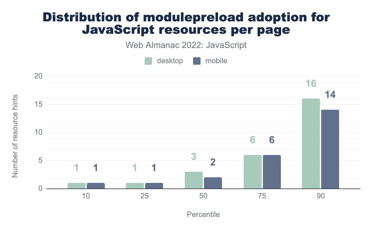 modulepreload では、75パーセンタイルで6個、90パーセンタイルで14個という驚異的な数のヒントが表示されました。このことから、上位のパーセンタイルで1つ以上の modulepreload ヒントを使用しているページでは、変換されていないES6モジュールを直接ブラウザに送信している一方で、非常に多くのリソースヒントが必要なため、上位の範囲ではJavaScriptに過度に依存していることが示唆されます。