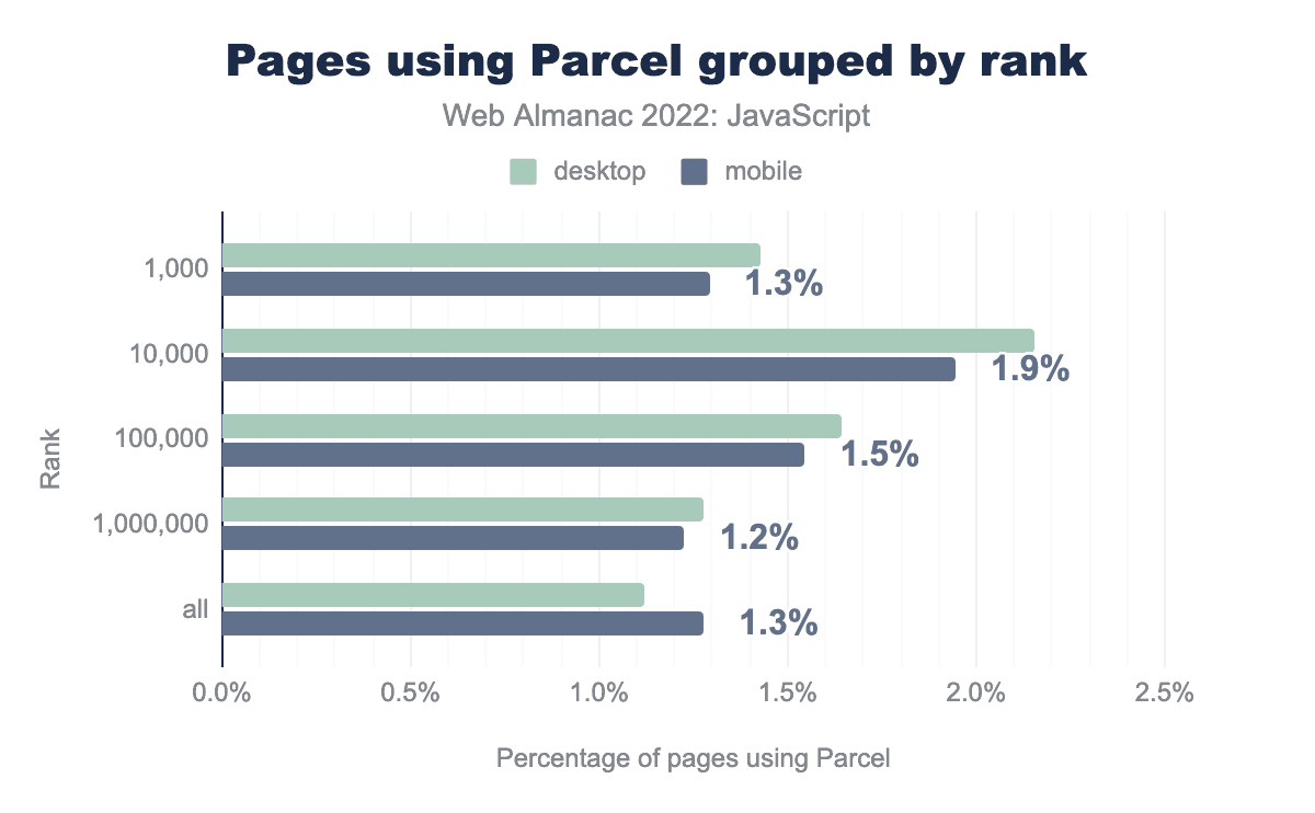 Parcelは、webpackの代替品として注目され、その採用実績は大きいです。Parcelの採用率はすべてのランクで一貫しており、ランク間で1.2%から1.9%の幅を占めている。