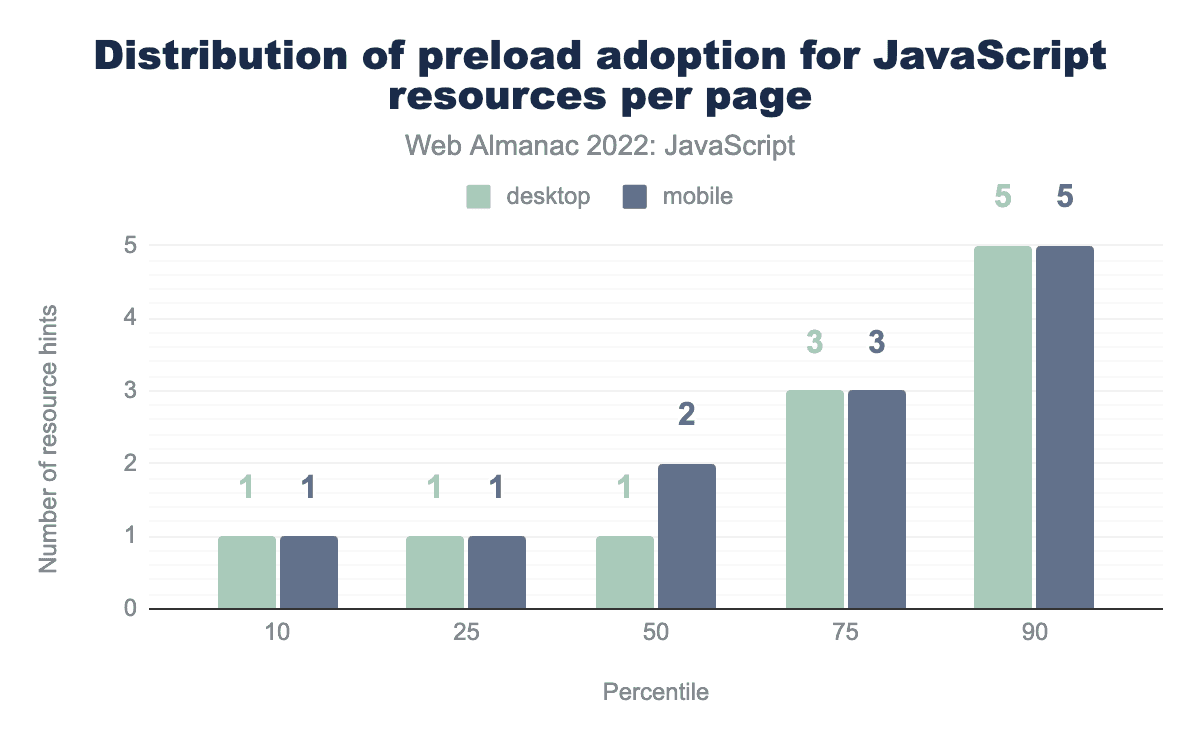 残念ながら、90パーセンタイルのJavaScriptリソースには5つの preload ヒントがあり、これは多すぎるかもしれません。これは、90%台のページがとくにJavaScriptに依存しており、その結果生じるパフォーマンスの問題を克服しようとして preload を使用していることを示唆しています。