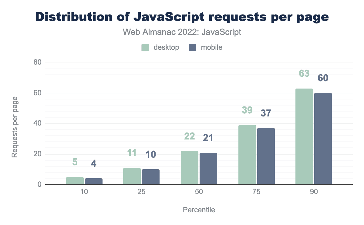 2022年、モバイルページの中央値は21のJavaScriptリクエストに応答したのに対し、90パーセンタイルでは60のリクエストに応答しています。昨年と比較すると、中央値で1リクエスト、90パーセンタイルで4リクエストの増加です。