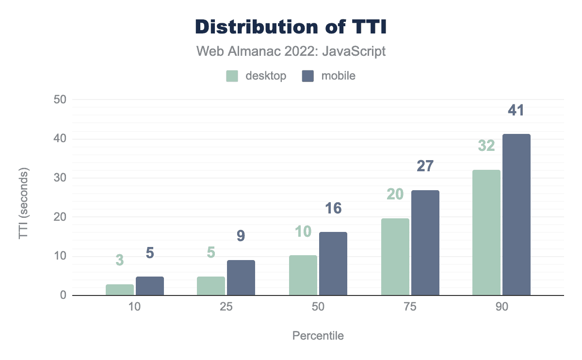 最後は、操作可能になるまでの時間(TTI)です。この指標は、5秒未満であれば「良い」と見なされます。10パーセンタイルだけがかろうじて5秒を切っていることから、シミュレーション環境のほとんどのウェブサイトがJavaScriptに依存しており、ページが適切な時間枠内でインタラクティブになることができません。とくに90パーセンタイルでは、インタラクティブになるまでに41.2秒という途方もない時間がかかっています。