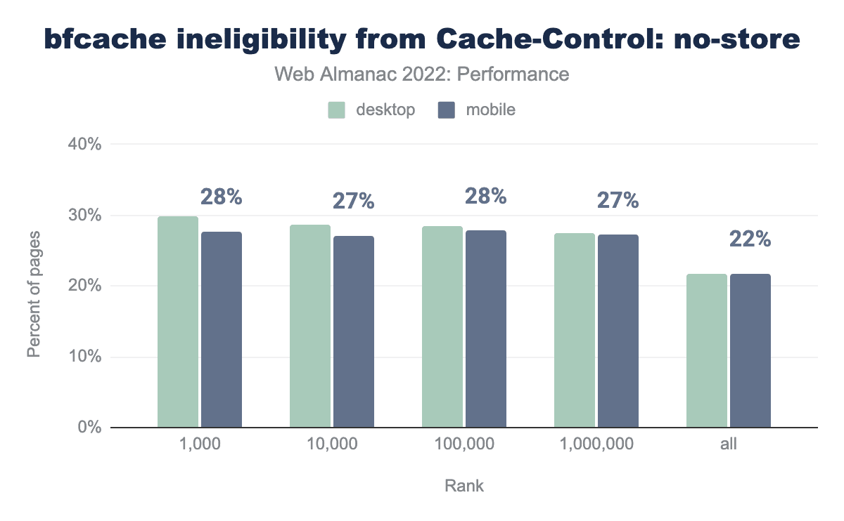 Cache-Control: no-storeヘッダーを設定することでbfcacheの対象外となるページの割合を示す棒グラフ。上位1千のモバイルページの28%がこのヘッダーを設定し、上位1万では27%、上位10万では28%、上位100万では27%、すべてのモバイルページでは22%です。デスクトップページは、最大で2パーセンテージポイント高い頻度でこのヘッダーを使用します。Cache-Control: no-storeの使用。