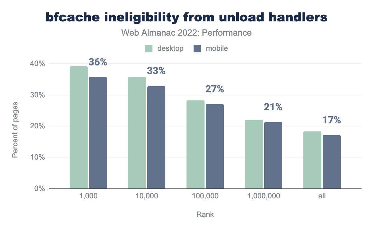 unloadハンドラーを設定してbfcacheの対象外となるページの割合を示す棒グラフ。上位1千のモバイルページの36%がこのハンドラーを設定しており、上位1万では33%、上位10万では27%、上位100万では21%、すべてのモバイルページでは17%です。デスクトップページは、ランクを問わず数パーセンテージポイント高い頻度でunloadハンドラーを使用する傾向があります。unloadの使用。