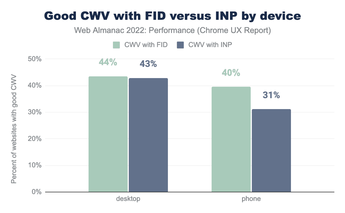 しかし、モバイル体験のウェブサイト間での差ははるかに劇的で、INPで良好なCWVを持つものは31%に減少し、FIDでは40%です。