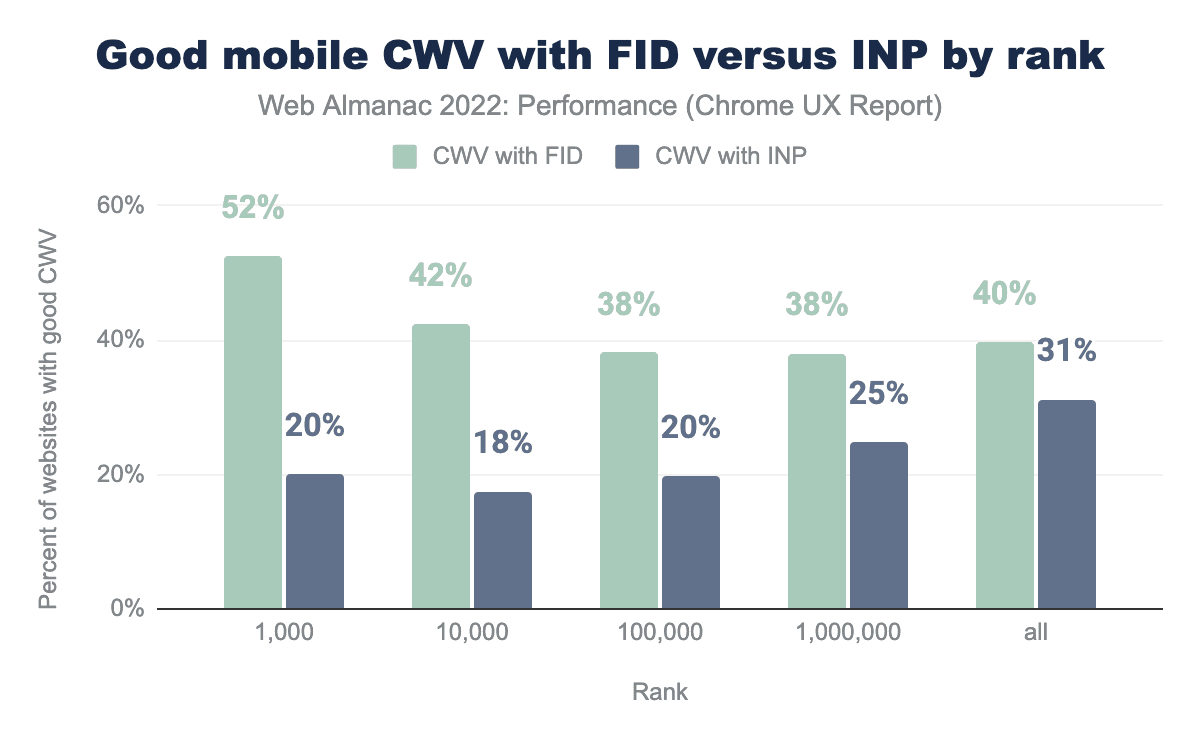 サイトランクによるモバイル体験を見ると、状況はさらに厳しくなります。FIDで良好なCWVを持つトップ1kのウェブサイトは52%ですが、INPでは20%のみが良好なCWVを持つことになり、32パーセンテージポイントの減少となります。したがって、もっとも人気のあるウェブサイトはFIDと比較して全ウェブサイト(52%対40%)で過剰にパフォーマンスを発揮していますが、INPでは実際には不十分(20%対31%)です。
