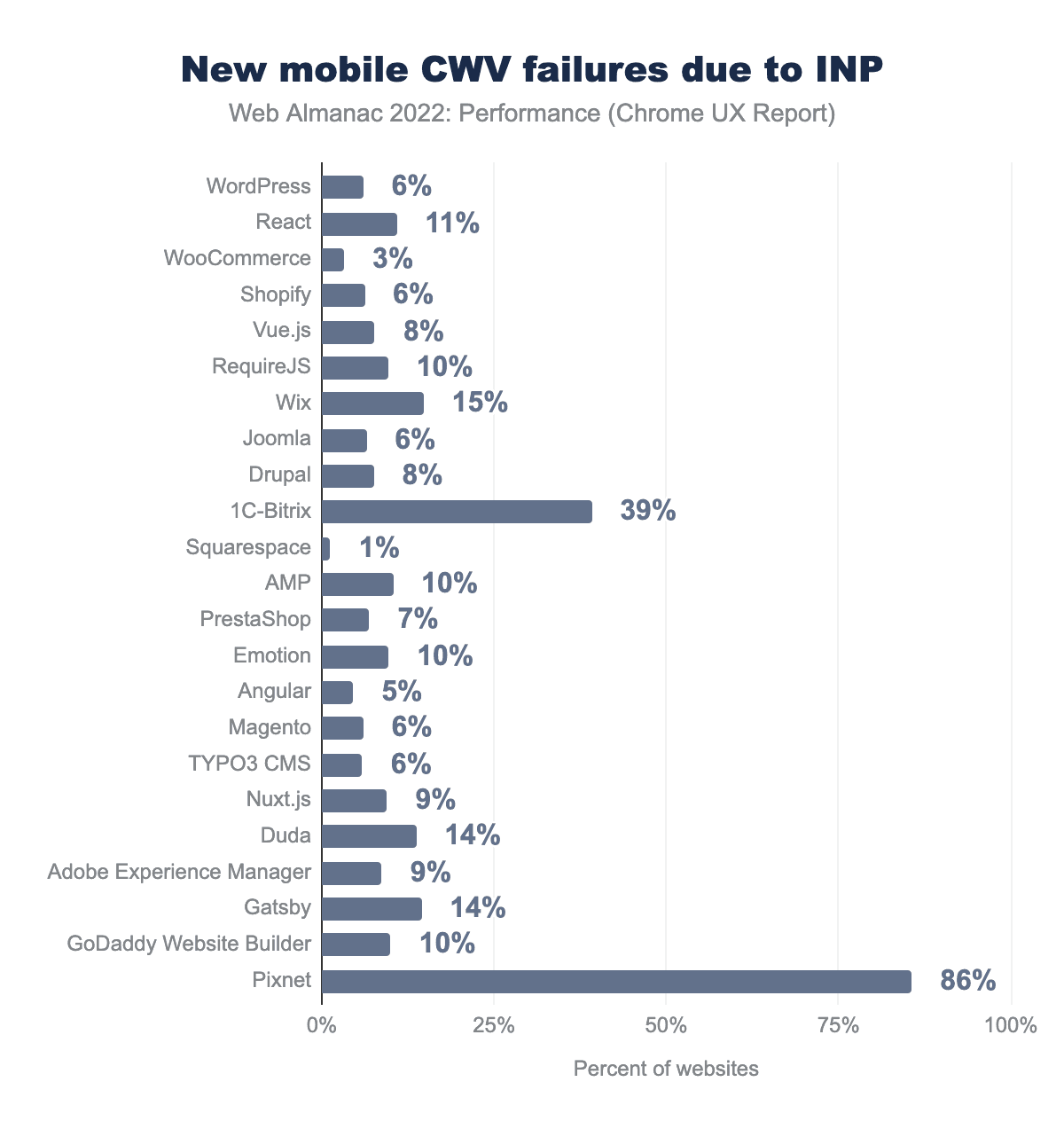 Reactフレームワークを使用するウェブサイトの11%がもはやCWVに合格しなくなります。Wixは現在2番目に人気のあるCMSで、Reactを使用しています。そのウェブサイトの15%が「良好」なCWVを持たなくなります。ただし、比例してWixウェブサイトは依然としてReactウェブサイト全体よりもCWVに合格する割合が高くなります、それぞれ24%と19%ですが、INPはその差を縮めるでしょう。