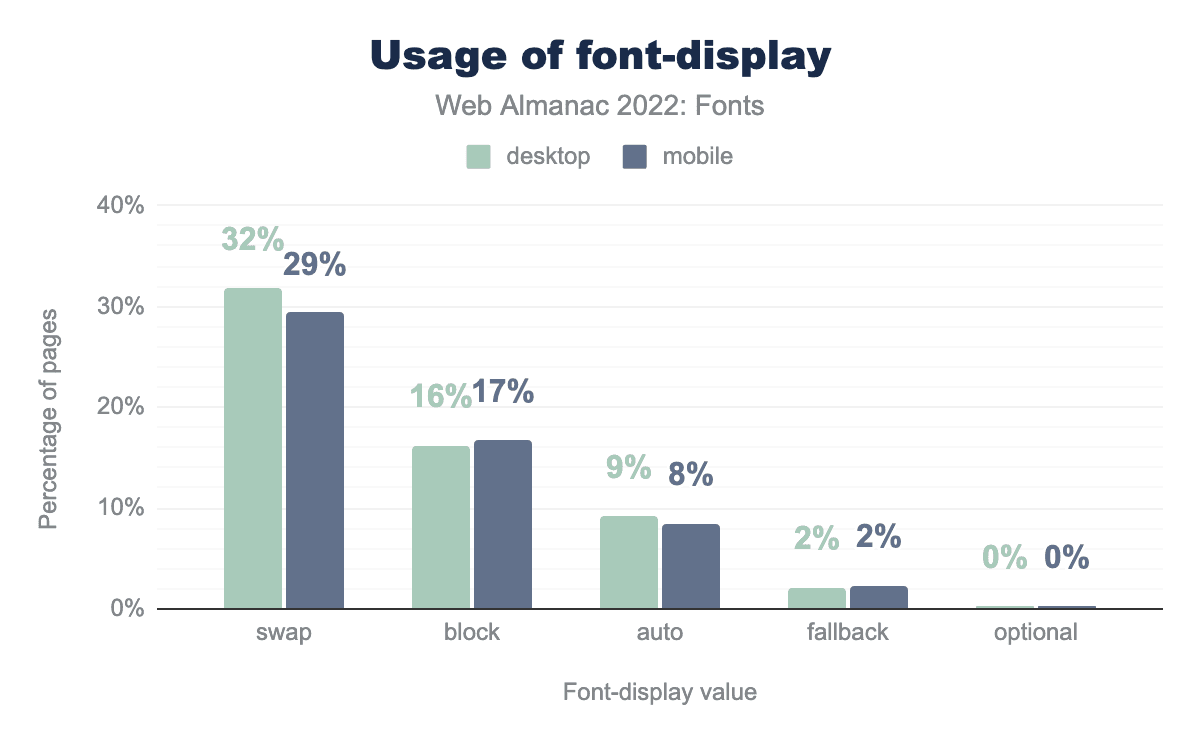 font-display値を使用しているページの割合を示す棒グラフ。モバイルページの29%がswapを使用し、17%がblock、8%がauto、2%がfallback、1%未満がoptionalを使用しています。デスクトップの値も同様です。font-display値の採用。