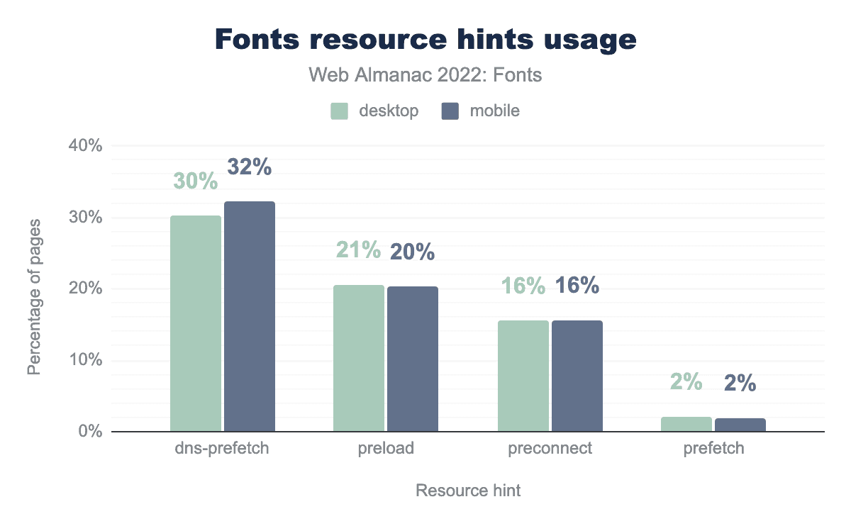 フォントの章によると、モバイルページの20%がWebフォントをプリロードしています。フォントをプリロードする際の1つの課題は、Googleフォントのようなサービスを使用している場合、正確なURLが事前にわからないことがあります。フォントホストへのプリコネクトは、パフォーマンスにとって次善の選択肢ですが、その使用しているページは16%に過ぎず、DNSのプリフェッチを使用するページの半分です。