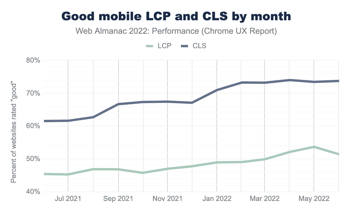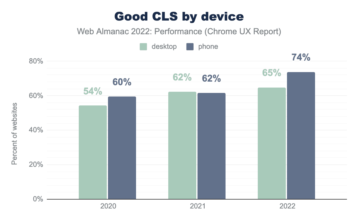 CLSは2022年にもっとも改善されたCWVメトリックであり、全体的に「良好」なCWVを持つウェブサイトの数に顕著な影響を与えたようです。
