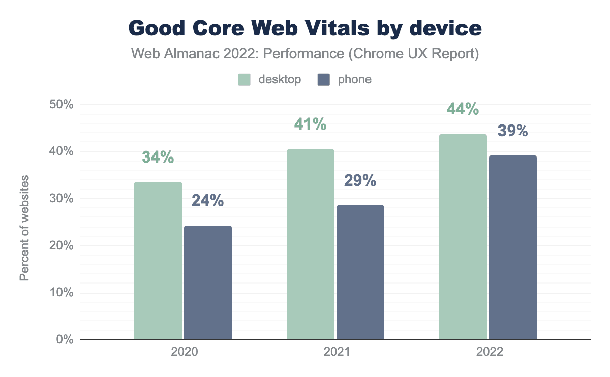 2021年には、モバイルユーザー向けのウェブサイトの29%が良好なCWVと評価されました。これは2020年からの大幅なステップアップで、5ポイントの増加を表しています。しかし、2022年の進歩はさらに大きな前進で、モバイルで良好なCWVを持つウェブサイトは39%になり、さらに10ポイントの増加を表しました!