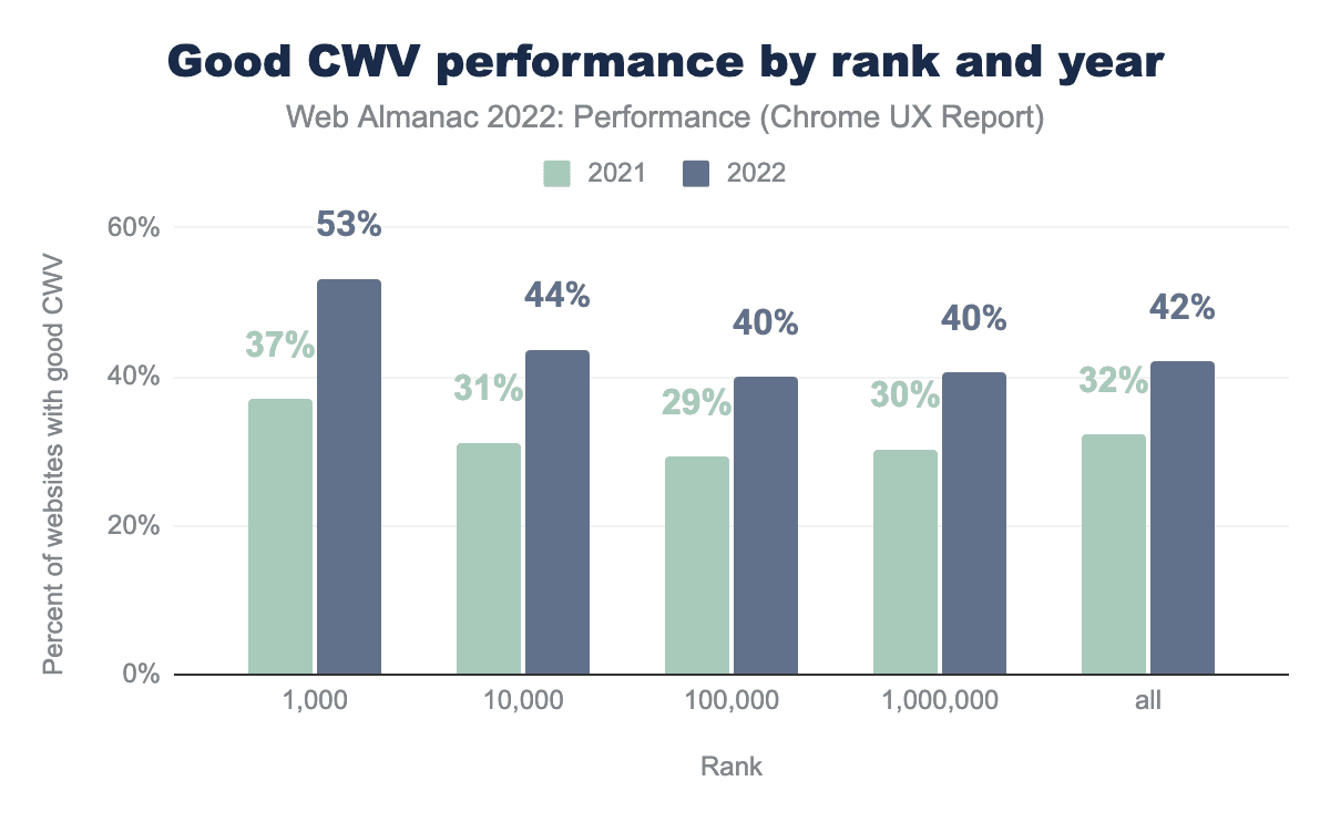 CWVを検索ランキングの一部にするというGoogleの決定は、多くの企業、とくにSEO業界でパフォーマンスを優先事項のトップに押し上げました。個々のサイトオーナーは確かにパフォーマンスを向上させるために一生懸命に取り組んでおり、このスケールではそれぞれの努力が目立ちにくいかもしれませんが、昨年のCWVの改善に大きな役割を果たしています。