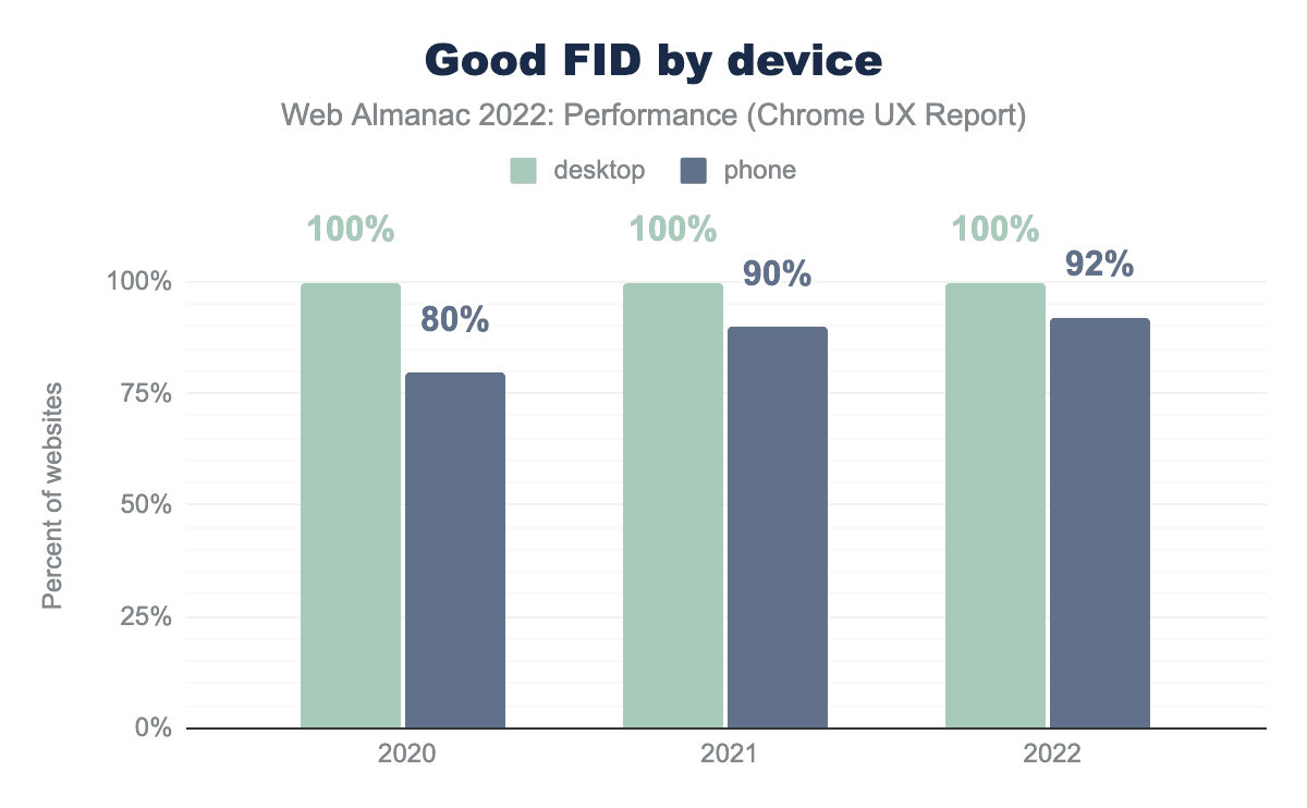 事実上すべてのウェブサイトがデスクトップユーザーに対して「良好」なFIDを持っており、この傾向は年を経ても変わっていません。モバイルのFIDパフォーマンスも非常に高速で、92%のウェブサイトが「良好」なFIDを持っており、昨年に比べてわずかに改善されています。