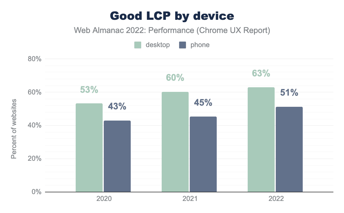 今年、モバイルで良好なLCP体験を提供するウェブサイトは51%で、デスクトップでは63%です。LCPは、ウェブサイトのモバイル体験が2022年に大幅に改善された主な理由の1つであり、今年は6ポイントの改善がありました。