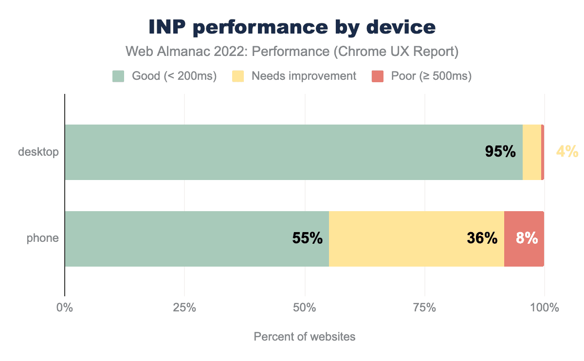 モバイルでのウェブサイトの55%が「良好」なINPを持ち、36%が「改善が必要」で、8%が「悪い」INPを持っています。デスクトップのINPの話はFIDに似ており、ウェブサイトの95%が「良好」と評価され、4%が「改善が必要」で、1%が「悪い」と評価されています。