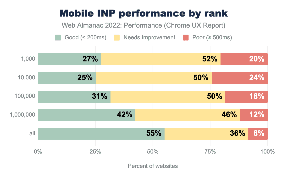 これらの結果は、もっとも人気のあるウェブサイトがINPを改善するためにもっとも努力が必要であることを示しています。