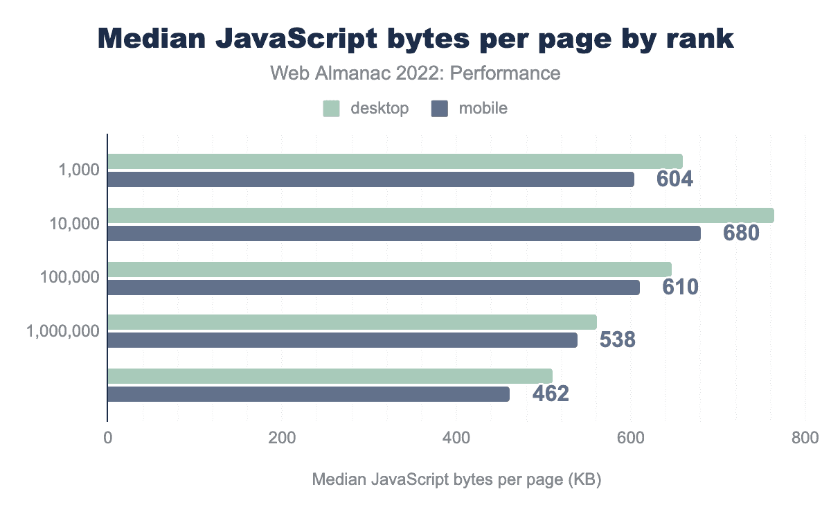 これらのランクごとにモバイルページがロードするJavaScriptの量を見ると、同じおもしろいパターンに従います!トップ1kのモバイルページの中央値は604KBのJavaScriptをロードし、トップ10kでは680KBに増加し、全ウェブサイトでは462KBまで下がります。これらの結果は、多くのJavaScriptをロードして使用することが必ずしも悪いINPを引き起こすわけではないが、確かに相関関係が存在することを示唆しています。