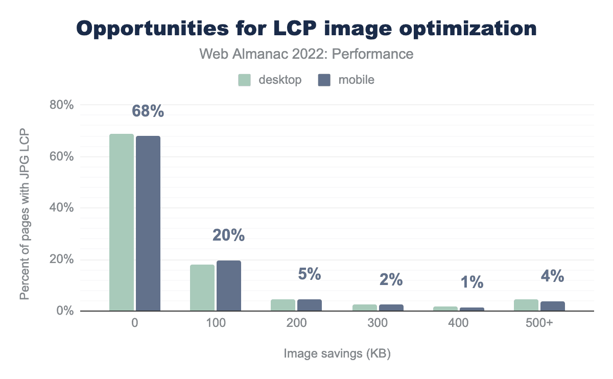 Lighthouseによってフラグが立てられたJPGベースのLCP画像を持つページのうち、68%は損失圧縮のみでLCP画像を改善する機会がありません。これらの結果はやや驚きであり、多くの「ヒーロー」JPG画像が適切な品質設定を使用していることを示唆しています。それにもかかわらず、これらのページの20%は最大100KB、4%は500KB以上節約できます。LCP画像の大多数が200KB以下であることを思い出してください。これはかなりの節約です!